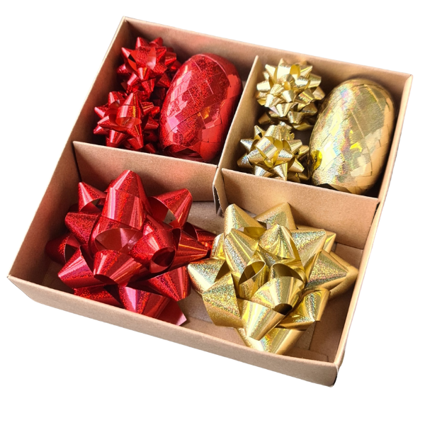 What’s in the box? * 2 x 5m poly ribbon eggs (5mm) * 8 x poly star bows (40mm) * 2 x poly star bows (80mm)